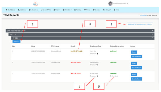 The eLean application used to carry out the TPM checks has the functionality of searching for the reports in a given period of time for all working machines (item 1, Figure 7) and the reports for individual working machines (item 2, Figure 7). In addition to the control result expressed as a percentage (positive result above 50%), the report result is presented numerically for individual control points (CP). The first numeric value of 3 represents the number of points to be checked. Successive numerical values mean, respectively, two points compatible and one point inconsistent (item 3, Figure 7). In addition, the eLean application indicates the employee who carries out the CP (item 4, Figure 7) and specifies the statute of the control result, its confirmation and comments in the event of rejection (item 5, Figure 7).