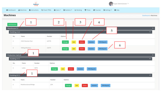 The next screenshot of the eLean application shows a list of machines in individual areas in the enterprise (Figure 8). In this part of the application, there is a panel for managing production machines (item 2, Figure 8). It is possible to correct the information about machines by editing (item 3, Figure 8), deleting machines (item 4, Figure 8) and statistical data from the TPM control (item 5, Figure 8) and the TPM control reports for individual machines (item 6, Figure 8).