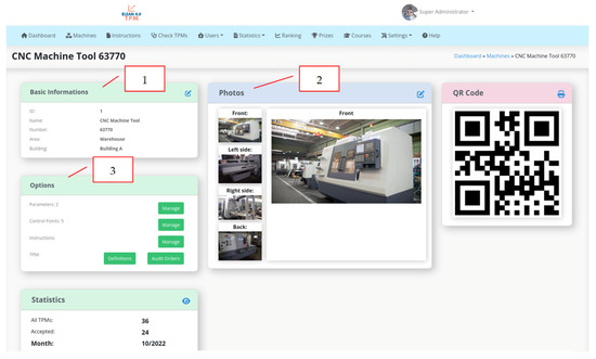 The screenshot in Figure 9 shows an example TPM control panel for a Computerized Numerical Control (CNC) machine tool 63770. The panel contains basic data about the machine (item 1, Figure 9). There are also pictures of the machine taken from the front, back, left and right (item 2, Figure 9). Additionally, the panel contains important optional data (item 3, Figure 9), such as parameters (production machine), control points and instructions; it also includes definitions (specify when, how, what and by whom it is subjected to control) and orders (generating orders is also included in the definition).