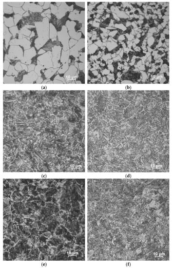 Both micrographs of SAE 1020 and SAE 5120 in normalized conditions (Figure 1a,b) show an obvious ferritic–pearlitic microstructure. In these micrographs, ferrite is displayed as whitish areas and pearlite is indicated by black cementite lamellas and white ferrite areas in between. For SAE 5120, the grain size of the ferrite is only up to approx. 30 µm, while the grain size of the ferrite in SAE 1020 is much larger, on average up to 50 µm. For all the specimens quenched and tempered (Figure 1c–f), typical lath-shaped martensite phases can be seen. The ferritic regions are irregularly arranged in blocks or strips between the bainite/martensitic slats and are easier to be identified if the tempering temperature is higher. The larger amount of ferrite is, therefore, an indication of a higher recovery rate of the meta-stable martensite. Due to the higher Mn content in SAE 5120, the martensitic transformation temperature is lower, so more retained austenite can be observed. The carbide phases in Figure 1f are, therefore, also better distributed in comparison to SAE 1020 +QT250, as shown in Figure 1e.