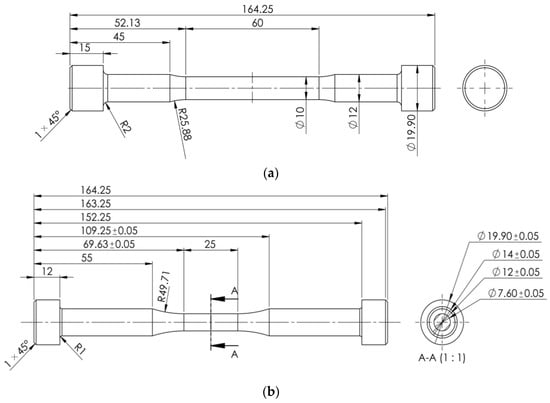 Dimensions of the applied (a) tensile specimen; (b) fatigue specimen.