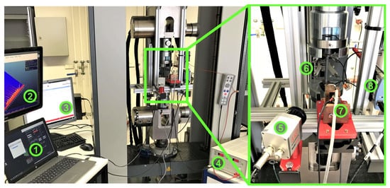 Applied tensile testing system with measuring techniques and related devices: 1. PC for DAQ (data acquisition) of the IR camera and ER; 2. PC for the MBN measurement; 3. PC for tensile test machine control; 4. DC power supply for ER; 5. IR camera; 6. Tactile extensometer; 7. MBN sensor mounted on a sliding rail; 8. Electrodes and sensing wires of the four-point DC resistance measurement with DAQ device.