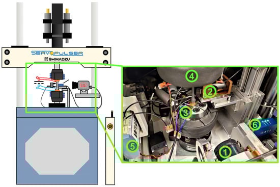 Stress (force)-controlled constant amplitude tests (CAT), as well as load increase tests (LIT), were carried out uniaxially without superimposed mean stress (R = −1) at ambient temperature with a load frequency of 5 Hz and a sinusoidal load-time function on a servohydraulic testing system type EHF-U by Shimadzu (Shimadzu Europa GmbH, Duisburg, Germany). The complete experimental setup is shown in Figure 4.