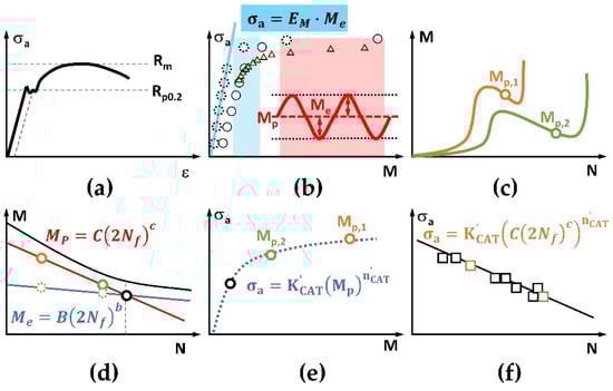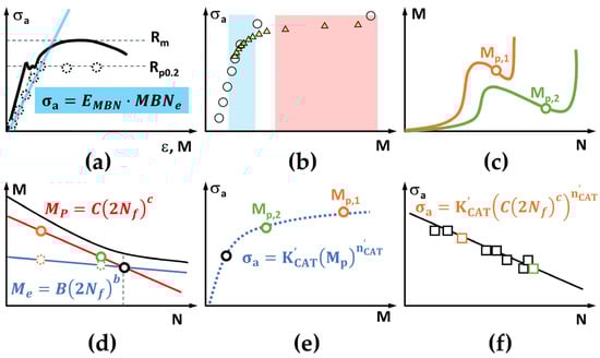 Schematic procedures of MaRePLife for measuring techniques with discrete data acquisition (e.g., magnetic Barkhausen noise). (a) Tensile test for Rm and Rp0.2 determination. The slope (blue straight line) of the material response (round dots with dotted line) in the elastic region is used for the determination of the elastic modulus. (b) First LIT (plastic portion: white round dots, solid line) and second LIT (plastic portion: yellow triangles) for the determination of the stress amplitude of both upcoming CATs (selected in the red and blue areas); (c) Both CATs and their plastic response Mp. (d) Elastic (round dots with dotted line) and plastic (round dots with solid line) portion calculated following Basquin and Coffin–Manson laws to find the partitioning point (round dot, black solid line). (e) Allometric regression of the plastic responses for obtaining K’CAT and n’CAT. (f) Calculated S–N curve with both CATs used and more CATs for verification.