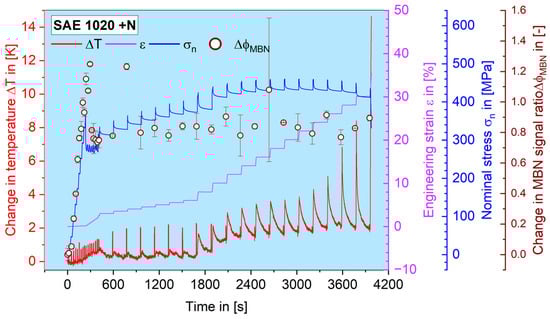 At the beginning of each test series, a tensile test was carried out in order to simultaneously define the tensile strength Rm, the yield strength Rp0.2, as well as the elastic modulus EMBN of the MBN signal. It can be seen in Figure 8 that the temperature change during the loading sequences was becoming increasingly higher. This explains the necessity of conducting the MBN measurement discretely during strain-holding sequences where the engineering strain was kept constant, to avoid possible thermal impact. Since the tensile test is controlled by strain, the stress response during each holding sequence would drop slightly due to slight cold work hardening processes. The MBN measurements always took place at the end of each holding sequence, to make the MBN–stress correlation reliable. At the beginning of the test, it can be seen that the elastic response of the MBN signal is very sensitive and forms a grade line over the whole elastic region. After the yielding process, the MBN signal drops back and does not show a significant change as the plastic deformation keeps increasing, which corresponds to the result shown in [].