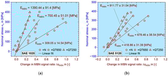 MBN signal responses in terms of ΔφMBN caused by elastic deformation during tensile tests on (a) SAE 1020 and (b) SAE 5120 in the differently heat-treated (+N: normalized, +QT650: quenched and tempered at 650 °C and +QT250: quenched and tempered at 250 °C) conditions. The slopes are interpreted as the elastic modulus for the MBN signal EMBN, which has MPa as its unit.