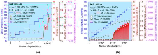 The results of both LITs conducted on SAE 1020 (Figure 10) in normalized material conditions are shown below as an example for the operation of the MaRePLife procedure. All calculated plastic material responses derived from the three aforementioned measuring techniques are presented: the change in temperature, ΔT; the change in MBN signal ratio, ΔφMBN; and the change in electrical resistance ratio, ΔφR. As described in [], the tests were not performed with continuous load, but with inserted load-free sequences. The progress of ΔTp–N curves are shown in a continuous way, while the mean values from each load step of ΔTp, ΔφMBN,p and ΔφR,p are emphasized with dots of different shapes. Obvious changes in the values of all three quantities in the plastic region can be observed. The second LIT had a connection problem in the ER measurement, so that the data points were unfortunately lost (from σa = 230 MPa onwards), but this does not change or disturb any further steps.