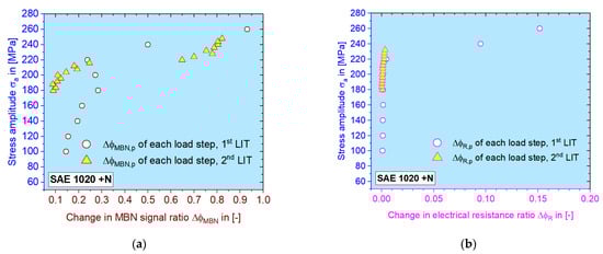 It can be seen in Figure 11 that the plastic portion of both materials generally increase, but at certain stage, the MBN signal falls, as already shown in []. The data point from the second LIT covered the elastic–plastic region and gives an idea of the choice of the stress amplitudes for the upcoming CATs. As mentioned before, the last four data points of the change in the electrical resistance ratio from the second LIT were lost.