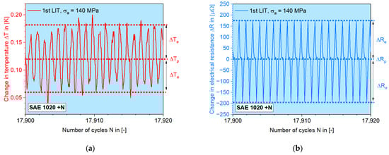 In analogy to the definition of the elastic strain amplitude/range, which, for the elastic deformation, is exactly the same as the amplitude of the continuous periodic (sinusoidal) strain–time function, the elastic portion of the change in temperature or change in electrical resistance data Me can be exactly defined as the amplitude of the periodic signal (Figure 5b). According to the thermoelastic theory proposed by William Thomson (Lord Kelvin) [], this quantity should be linearly correlated to the stress (amplitude). The net change during each load cycle, which is calculated here as the mean value of all data points from each load cycle, is considered as the plastic portion Mp, even though the corresponding plastic strain amplitude/range is not exactly defined in the same way. However, practical experience has shown a very good correlation between both quantities [,,] so that the authors find it reasonable to further apply it in this way. By observing the σa–Mp chart of both LITs, the stress amplitudes for both upcoming CATs can be determined. The first one should be in the transition range from the elastic to plastic region (Figure 5b and Figure 6b, the blue marked section), and the second one should mostly be in the plastic range (Figure 5b and Figure 6b, the red marked section).