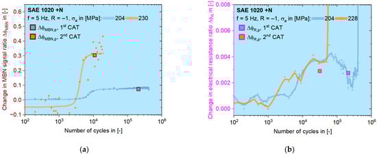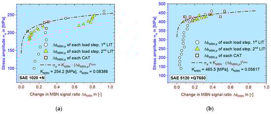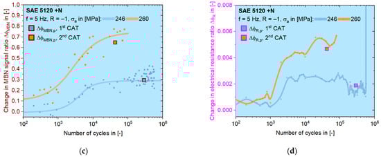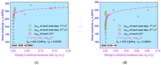 According to Figure 11, the first CAT should be conducted with a stress amplitude of 190–210 MPa, while the second one can be chosen as 224–240 MPa, which results in highly plastic responses during LIT. Depending on the data validity of single CATs, 204 and 230 MPa are chosen for the calculation with MBN data ΔφMBN (Figure 14a). ΔφR analysis was performed on CATs with 204 and 228 MPa as the stress amplitude (Figure 14b). Two more results for normalized SAE 5120 are shown in Figure 14c,d, where both amplitudes are chosen as 246 and 260 MPa according to the corresponding results of LITs.