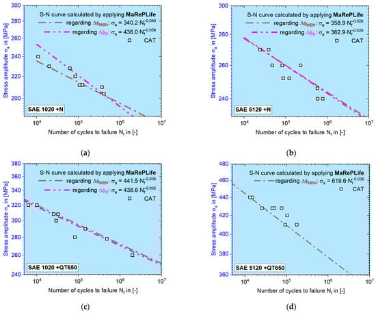 After K’ and n’ are solved, the S–N curves can be calculated. Figure 16 shows S–N curves derived from electrical resistance and MBN features for the selected materials/material conditions investigated within the frame of this work. It can be seen that for the HCF regime, the calculated S–N curves can be supported by the CAT data points. By selecting the parameters of CATs according to the results of tensile tests and load increase tests, the HCF regime of 104–2 × 106 can be described properly. Some of the measured values from the electrical resistance for SAE 5120 were invalid due to earlier experiments with outdated load-free sequence parameters.