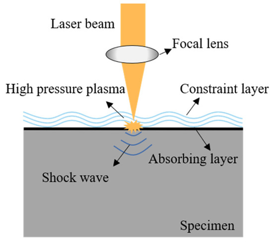 Surface-strengthening methods include mechanical shot peening, water jetting, rolling, and laser shock [11,12,13,14]. Laser shock peening (LSP) is more efficient because of its high pressure and ultra-high strain rate. It causes significant plastic deformation on the surface of the specimen, introduces residual compressive stress, refines the grain, and improves the fatigue life of the treated specimen [15,16,17,18].