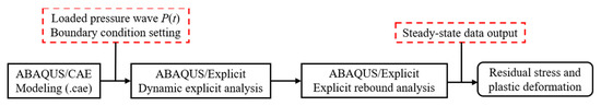 The finite element method was used to construct a numerical simulation model of a 20CrMnTi specimen for single-point shocks. A combination of explicit dynamic analysis and explicit rebound analysis was used to simulate and analyze the equivalent plastic deformation and residual stress distribution of the 20CrMnTi sample subjected to shock waves induced by laser shock. The model was based on the interaction of shock waves with materials, and other phenomena, such as radiation and convection, were not considered of interest to this study. The specific simulation process, outlined in Figure 2, was divided into four main sections: the finite element modeling of the metal specimen, laser shock pressure input, computational solution (including explicit dynamic analysis and explicit rebound analysis), and the analysis of results.