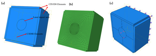 The neutral-axis algorithm was used to divide the grid, and the central area of the model was the impact spot area and the area of local refinement. The more detailed the meshes, the more accurate the results. The accuracy of residual compressive stress and deformation increased with continuous mesh refinement. When studying the correlation between the mesh size and simulation results, the residual compressive stress and deformation tended to be stable when the mesh size was equal to or smaller than 0.02 mm for the impact area and the mesh size was equal to or smaller than 0.10 mm for other parts of the specimen. Thus, considering the calculation time and solving efficiency comprehensively, the mesh size was 0.02 mm for the impact area and 0.10 mm for other parts of the specimen in the model. In order to ensure that the FE model behaved as closely as possible to reality, infinite boundaries were imposed around the model with a thickness of 0.5 mm, which eliminated the stress reflection, and the bottom of the model was fixed. The element type of infinite boundaries was CIN3D8, while the element type of the other part was C3D8R. The number of elements was 546,240, with an average aspect ratio of 23.5, and the largest aspect ratio was 163.6. The maximum angle of the elements was 149, which was less than the warning value of 160. The average geometric deviation factor was 1.1 × 10−5, and the maximum geometric deviation factor was 0.0028. There were no mesh analysis errors. The mesh quality met the analysis requirements, and the calculation results were convergent. The FEM model of the 20CrMnTi specimen is shown in Figure 3.