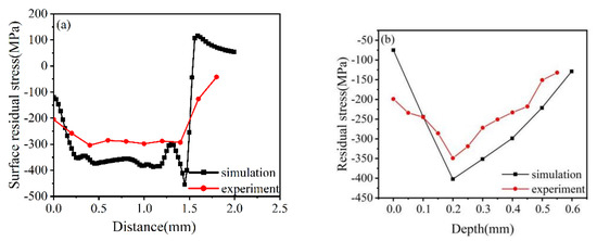 The residual stresses at all measurement points were measured thrice and averaged to reduce the experimental error. The results in the surface and depth directions were compared with the numerical simulation results. As illustrated in Figure 5, the variation trend of the simulated surface residual stress is the same as that of the experimental results, with a difference of about 20%.