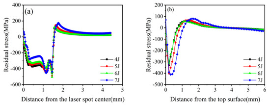 The surface residual compressive stress was negatively correlated with the laser pulse energy when the energy increased from 4 to 7 J (Figure 6a). When the energy increases to 7 J, the residual tensile stress appears in the center of the spot, which implies the occurrence of an overshot peening phenomenon, which is not conducive to the improvement in the fatigue strength of the material. The residual compressive stress along the depth direction first increased with the increase in laser pulse energy and then stabilized. As the maximum residual compressive stress was approximately 200 μm from the surface, the residual compressive stress affected approximately 0.9 mm of the layer. The maximum residual compressive stress tended to saturate when the laser pulse energy was 5 J (Figure 6b). The tensile residual stress around the center of the spot was observed, known as the “residual stress hole,” due to the convergence of surface release waves and the interaction between impact and inertial forces on the material surface [35,36]. The tensile residual stress around the edge was due to the “boundary effect.”