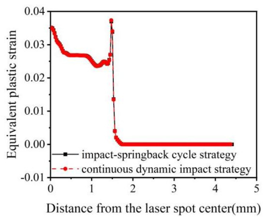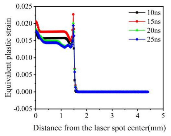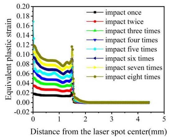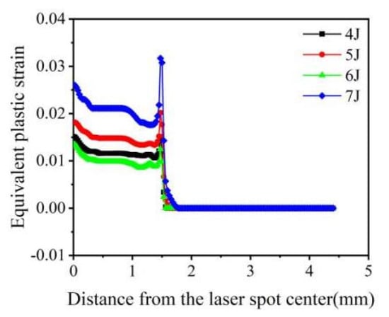 The equivalent plastic strain was positively correlated with the change in laser pulse energy (4 J, 5 J, and 7 J) (Figure 7). However, when the pulse energy was 6 J, the equivalent plastic strain was minimum. With the increase in energy, surface hardening becomes more serious. When the energy was 5 J, saturation occurred. When the energy increased to 6 J, the equivalent plastic strain decreased due to the action of a reverse loose wave. When the energy further increased to 7 J, cracks might occur on the surface, surface relaxation would occur, and deformation further increased. The equivalent plastic strain at the center of the light spot was large, which was caused by the reverse plastic deformation of the material caused by the “residual stress hole.” The equivalent plastic strain at the edge of the optical spot sharply changed and became 0. The nature of equivalent plastic strain distribution is highly uneven, as residual stress and tensile residual stress are observed around the center and at the edge of the impact spot. The smaller equivalent plastic strain at the central region of the spot is caused by the reverse plastic deformation of the sparse wave reverse loading [37].