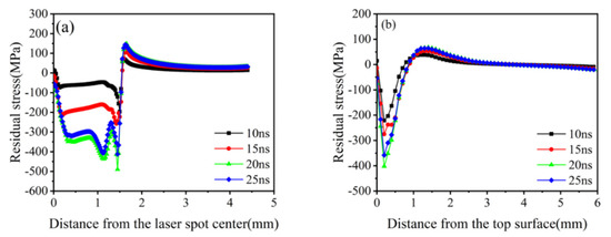 Residual stresses in 20CrMnTi at different pulse widths. (a) Surface residual stress distribution; (b) Depth direction residual stress distribution.