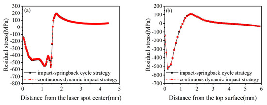In the post-processing stage, residual stresses in the vertical and horizontal directions and the equivalent plastic strain (PEEQ) were selected for each node in the horizontal and depth directions according to the characteristics of the stress and strain fields of single-point LSP.