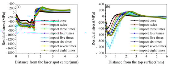 Figure 12a depicts that the surface residual compressive stresses increase when the number of impacts is increased from 1 to 8. However, the residual tensile stress appears in the center of the spot with five impacts. Figure 12b shows that the residual compressive stress along the depth direction increases with the number of impacts when it increases from 1 to 5, reaching a maximum of 5. When the number of impacts increases from 6 to 8, the residual surface stress is also positively correlated with the number of impacts. Still, both are smaller than the residual compressive stress when the number of impacts is five. In addition, except for the case of five shocks, the center of the spot shows a serious “residual stress hole” phenomenon. From the comprehensive surface and depth direction analysis, all five impacts produce optimal stress-strengthening effects; the residual compressive stress affects layer depths greater than 1 mm, and the maximum residual compressive stress is 1085 MPa.