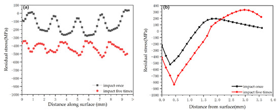 Residual stress of 20CrMnTi for different impact numbers. (a) Surface residual stress distribution; (b) Depth direction residual stress distribution.