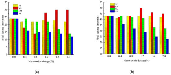 Figure 1. Effect of nano-oxides on setting time of grouting material. (a) Initial setting time; (b) Final setting time. The meanings of NF, NA, NM, and NS are Nano-Fe2O3, Nano-Al2O3, Nano-MgO, and Nano-SiO2, respectively.