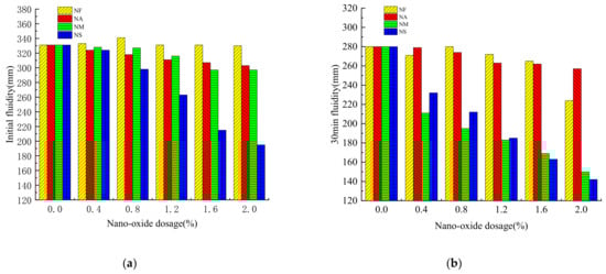 Figure 2. Effect of nano-oxides on fluidity of grouting materials. (a) Initial fluidity; (b) 30 min fluidity. The meanings of NF, NA, NM, and NS are Nano-Fe2O3, Nano-Al2O3, Nano-MgO, and Nano-SiO2, respectively.