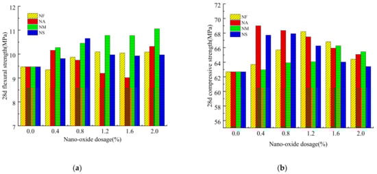 Figure 3. Effect of nano-oxides on 28d strength of grouting material. (a) 28d flexural strength; (b) 28d compressive strength. The meanings of NF, NA, NM, and NS are Nano-Fe2O3, Nano-Al2O3, Nano-MgO, and Nano-SiO2, respectively.