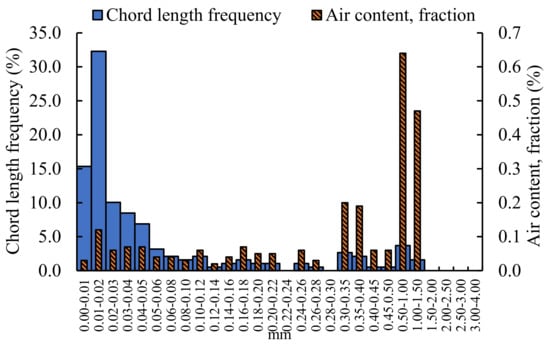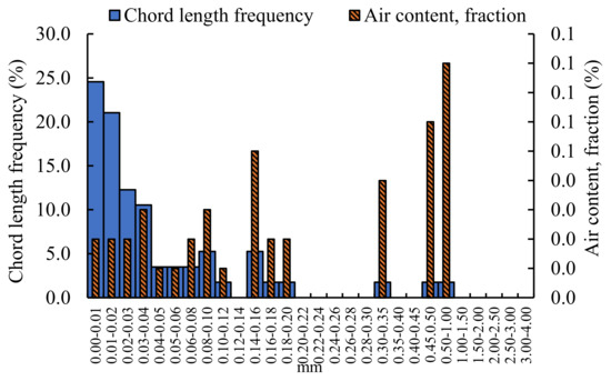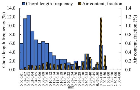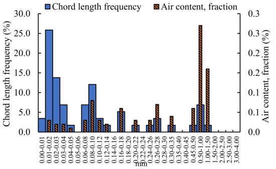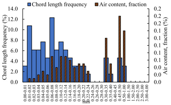 As can be seen from Figure 6, the size of the pores mixed with 0.4% NA grouting materials ranges from 0.00 to 1.50 mm, and the air content is the largest in the size of 0.50–1.00 mm, which is 0.64%, followed by 1.00–1.50 mm, which is 0.60%. From the chord length frequency, the pore size is the largest in the area of 0.01–0.02 mm, accounting for 32.28%, and the chord frequency in the 0.02–0.05 mm aperture range is slightly higher than other aperture ranges. It can be concluded that there are individual large pores in the pores structure mixed with NA grouting material, and the micro-dense pores are still the main ones.