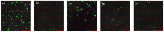 The internal cutting surface of the grouting materials was scanned and photographed by rapid air equipment; the cross-section was scanned, and 800 pictures were obtained. The small images were then combined into a stomatal scanning structure picture of the cross-section of the grouting material. In the picture, the black part is the grouting material, and the green part is the pores of different sizes and structures. By analyzing the content, size, and shape of air pores in the cross-section scan of the grouting material, the influence of nano-oxides on the grouting material was further clarified. Figure 9 shows the scanning diagrams of pore structures of grouting materials without nano-oxide and with 1.2% NF, 0.4% NA, 1.6% NM and 0.8% NS.