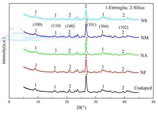 In order to study the effect of incorporating different nano-oxides on the grouting materials, the grouting materials doped with nano-oxides were selected for XRD. The age of the grouting materials were 28 days, and the results are shown in Figure 10.