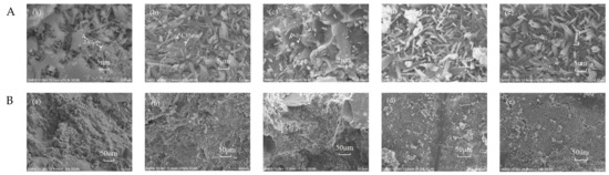 Figure 11. SEM image of grouting. (A): Grouting materials amplified to 5 μm: (a) Undoped; (b) 1.2% NF; (c) 0.4% NA; (d) 1.2% NM; (e) 0.8% NS. (B): Grouting materials amplified to 50 μm: (a) Undoped; (b) 1.2% NF; (c) 0.4% NA; (d) 1.2% NM; (e) 0.8% NS.