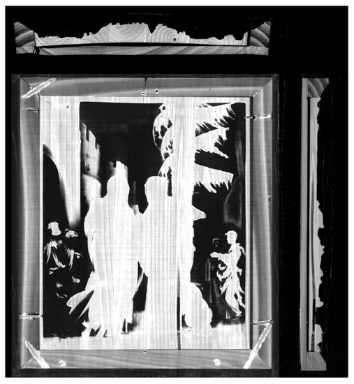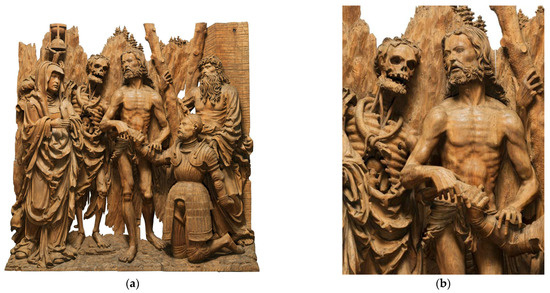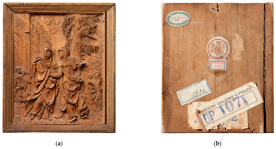 This paper presents the results of the material investigation of wooden artworks from the collection of the National Gallery Prague created by one of the most remarkable carvers of the Salzburg-Passau region of the first third of the 16th century, generally referred to as Monogrammist IP. The small and fragile relief of Visitation (Passau, after 1521, Inv. No. P 5197, Figure 1) is one of the few works bearing the signature “IP” (Figure 2) [1,2,3,4,5]. The artist’s monogram appears in the middle bottom part of the panel. The relief was created as a cabinet masterpiece. Its composition is inspired by sheet B. 84 (Visitation) from Albrecht Dürer’s series of woodcuts depicting Marian themes (1501–1511). It is very detailed, testifying to the artist’s mastery of relief-carving techniques. On a very small surface, the Visitation scene unfolds in several spatial planes; the artist conveyed the impression of space through perspectival foreshortening of the architectural frame and the thoughtful distribution of high and low relief. The characteristic devices of the Danube School style include the dynamic interpretation of the drapery and details of the landscape, which appear in other carvings by Monogrammist IP and his circle. There are many parallels to the Monogrammist IP’s works in paintings, drawings and prints by other leading representatives of the Danube School, namely Wolf Huber and Albrecht Altdorfer. Similar stylistic features can be observed in not only small-format carvings but also larger artworks. Zlíchov Altarpiece—another piece by Monogrammist IP from the collection of the National Gallery Prague subjected to comparative research—belongs among these types of artworks. The Zlíchov Altarpiece is composed of a central part depicting Christ the Saviour from Death (Passau, before 1526, NGP, inv. no. P 4673), while the other parts feature the Judgement Day, Christ on the Mount of Olives, Christ Appears to the three Maries, Penitent St Jerome, St Francis Receiving the Stigmata, St John the Evangelist, St Luke the Evangelist, St Matthew the Evangelist and St Mark the Evangelist (Roman Catholic Parish in Zlíchov loaned to the National Gallery Prague, Inv. Nos. P 4673–7, VP 772–6) [3].