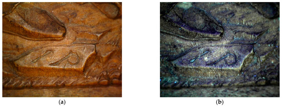 Photomicrographs in VIS (a) and UV light (b) of the monogramme.