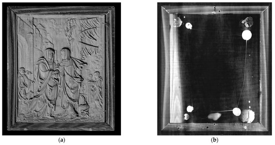 The high-resolution documentation provided precise data on the original mounting and construction of the relief panel as well as data regarding the surface and depth of the carving (Figure 4a), including evidence of original and secondary interventions and colour modifications. As evident from the visual assessment, the Visitation relief is set in a moulded frame with a backing board.