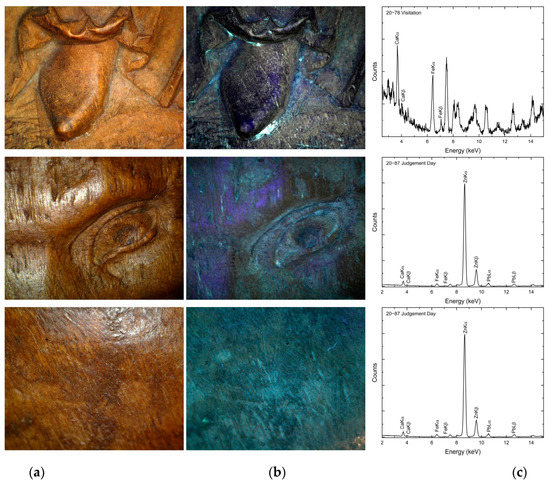 Photomicrographic documentation of the surface in visible (a) and UV light (b) with a fragment of secondary polychromy and corresponding XRF spectra (c); from the top: Visitation, St Luke the Evangelist and Judgement Day.