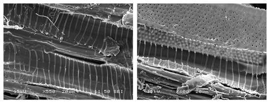 To observe the character of the monochrome glaze layer, we performed an analysis of the sample from the central part of the Zlíchov Altarpiece, Christ the Saviour from Death, made of lime wood. The wood species was identified based on the presence of spiral thickenings in the vessels which are characteristic of lime wood (Figure 7). On the cross-section, an organic layer is visible under the fragment of secondary white polychromy (Figure 8). In the white layer, calcium carbonate (chalk) was identified by Raman spectroscopy based on characteristic band at 1085 cm−1. This pigment was confirmed by FTIR as well. Besides calcium from calcium carbonate, EDS analysis proved the presence of zinc characteristic of zinc white. Locally, the glaze layer contained magnesium, aluminium, silicon and iron, suggesting the presence of earth pigments.