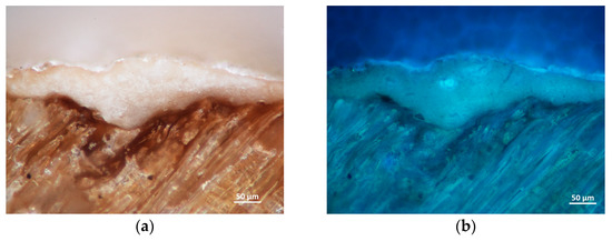 Documentation of the cross-sections was carried out on a Zeiss Axio Imager Z2m light microscope (Oberkochen, Germany) in reflected light, in a dark field and after excitation by UV light (λ = 385 nm, λ = 475 nm). Usual magnification was 200–400×. The cross-sections were documented using digital camera Axiocam 712 color and the images were processed in the ZEN core v3.1.1 and Adobe Photoshop.