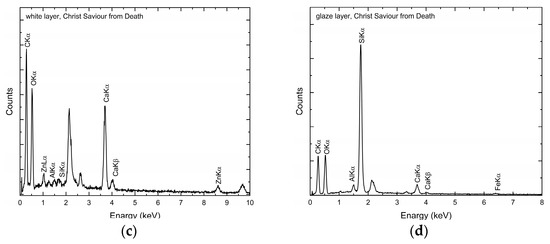 Cross-section of the sample from the surface with white polychromy from the carving Christ the Saviour from Death in visible (a) and UV light (b) and EDS spectra of the white layer (c) and glaze layer (d).