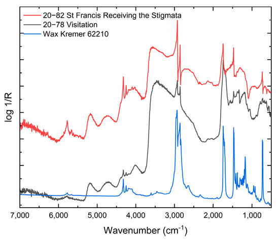 RE-FTIR spectra from the surfaces of reliefs St Francis Receiving the Stigmata and Visitation and corresponding spectrum of wax.