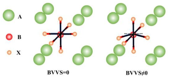 where is the atomic valence state, and is zero in the stable coordination sphere and is not zero when distortion occurs. Figure 1 shows a schematic diagram of the BVVS. The center is a B atom; ideally, the BVVS is zero, and when BX6 octahedral distortion occurs, the BVVS is non-zero.