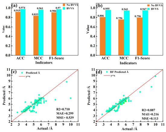 We conducted two sets of comparative tests before and after adding the BVVS to investigate the significance of the BVVS feature descriptor. Before and following the addition of the BVVS, respectively, the crystal system and perovskite space group were determined using RF, and the lattice constants were predicted. Table 5 contains the final RF hyperparameter settings. Figure 2a displays the test set identification results for seven crystal systems using the RF classification technique. The vertical coordinates correspond to the relevant particular values, while the horizontal coordinates represent the model performance metrics. ACC rose from 0.915 to 0.974, MCC increased from 0.883 to 0.961, and the F1-score increased to 0.970 after the addition of the BVVS. The results of the RF test set identification for 40 space groups of gathered perovskite are shown in Figure 2b. The 40 space groups’ identification accuracy (ACC), Matthews correlation coefficient (MCC), and equilibrium F-score (F1-score) had values of 0.806, 0.756, and 0.796, respectively, before the addition of the BVVS. After the addition of the BVVS, the ACC increased to 0.955, the MCC had a value of 0.943, and the F1-score increased to 0.947. The BVVS is crucial in determining the crystal shape. With the inclusion of the BVVS, the identification of crystal systems and space groups is greatly improved. Figure 2c shows the fitting results of the predicted lattice constant a on the test set of the RF regression model before adding the BVVS, where the horizontal coordinate is the true value of the lattice constant, the vertical coordinate is the predicted value, and the highest correlation coefficient R2 of the prediction is only 0.710. The results of the projected lattice constants fitted on the test set after the addition of the BVVS are shown in Figure 2d. The greatest R2 after the addition of the BVVS reaches 0.887, the MAE and MSE have also been greatly reduced, and the overall fitting impact has been significantly enhanced. The aforementioned comparison trials show conclusively that the addition of the BVVS can more correctly reflect the crystal’s structural properties. This is primarily because erections between the atoms that make up the crystal determine its structure and properties. These interactions are reflected in the chemical bonds that connect the atoms, and the behavior of these chemical bonds and associated crystal parameters are crucial characterization variables of such interactions that can be used to distinguish the structural differences between various crystals.