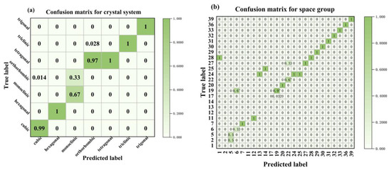 Confusion matrix for RF-identified crystal systems and space groups: (a) crystal system; (b) space.