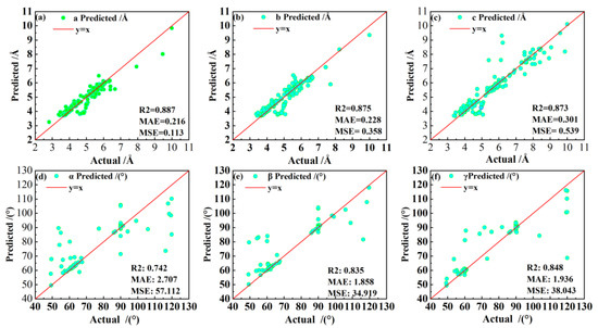 In contrast to earlier research [33,34], we estimated the lattice constants and automatically identified the space group of several perovskite materials using only a small dataset of 10 characteristics. The technique we employed is a combination of physically meaningful feature variables (BVVS) that quantifies lattice distortions relative to the constituent atomic features. This enables ML predictions to be physically interpreted and to be more controllable in the direction of the target feature variable. The accuracy of the crystal system and space group identification is far superior, especially the space group accuracy of 0.955, which is more outstanding, and the lattice constants can also be predicted, as shown in Table 6, when compared with the XRD-based ML method and the feature-descriptor-based methods of other works [18,33,34]. The confusion matrix of our RF recognition method for the crystal system and space group on the test set is shown in Figure 3. The horizontal coordinates are the recognized categories, the vertical coordinates are the true categories, the values in the squares indicate the percentage of the number of row label categories predicted as column label categories, and the larger values and darker color of the diagonal squares represent higher recognition accuracy, whereas the remaining squares with light colors represent lower recognition accuracy. Although the overall level of accuracy for each category identification remains high, certain lower values are directly tied to the sample distribution. Figure 4 depicts the prediction of all lattice constants, including a, b, c, α, β, and γ. When predicting a, b, and c, good accuracy is attained, and the maximum R2 value is 0.887; nevertheless, there is substantial dispersion when predicting angles, which is also probably due to the uneven sample of original data angles and inadequate model learning.