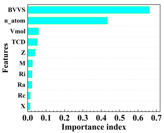 The significance of the BVVS feature descriptors under RF was further assessed, and the ML model feature ranking approach was used to rate the significance of these 10 feature descriptors. The feature variable importance histogram is shown in Figure 5. The ordinate in Figure 5 represents the 10 feature variables, and the abscissa is the feature importance coefficient. The larger the importance coefficient, the greater the contribution to the predicted value of the target feature variable. It is clear from the feature importance histogram that the BVVS makes the largest contribution to the identification of the crystal structure, further demonstrating its ability to effectively capture crystal structure data and support crystal structure identification. It is important to note that, as the bar chart illustrates, the number of atoms also makes a greater contribution to the target characteristic variables. This is because one fundamental characteristic of a crystal cell is the number of atoms present. The more atoms present in a crystal, the more permutations between those atoms, the more resulting distortions, and the more complex the crystal structure. The complexity of the crystal structure and the atom count are closely correlated. Different characteristic factors have varying degrees of influence on the crystal structure, including molar volume, Pauling electronegativity, atomic radius, average ionic radius, covalent radius, etc.
