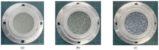 In this study, random packing was used as a packing structure for granular materials. Figure 1a–c shows the samples used to measure the sound absorption coefficient. Glass beads with diameters of 1 mm, 2 mm, and 4 mm were used in the experiments.