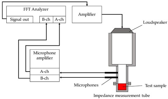 A Brüel & Kjær Type 4206 two-microphone impedance tube (Brüel & Kjær Sound & Vibration Measurement A/S, Skodsborgvej 307 DK-2850, Nærum, Denmark) was used to measure the sound absorption coefficient, and Figure 2 shows the configuration of the apparatus. As shown in the figure, a sample was enclosed in the impedance tube, a sinusoidal signal was output by the signal generator DS-3000 with a built-in fast Fourier transform (FFT) analyzer fabricated by Ono Sokki (Yokohama, Japan), and the transfer function between the sound pressure signals of the two microphones attached to the impedance tube was measured by the FFT analyzer. The measured transfer function was used to calculate the normal incident sound absorption coefficient in accordance with ISO 10534-2. The critical frequency for the formation of plane waves differs based on the inner diameter of the acoustic tube. Small tubes with an inner diameter of 29 mm were used because the sound absorption coefficient in the low-frequency range was not high enough for the samples used in this study. Therefore, the measurement range was 500–6400 Hz.