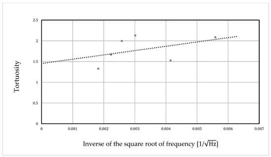 Table 1 shows the results of the tortuosity measurements, and Figure 4 shows a graphical representation. This was confirmed by the fact that the y-intercept of the approximation line indicated the complexity of each packing configuration. The measurement results show that the tortuosity was α∞ = 1.45.