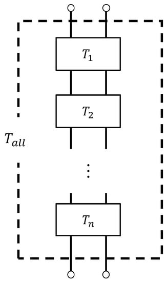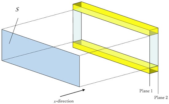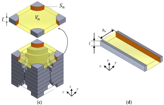Using a one-dimensional wave equation, the transfer matrix method was used to derive the clearance between the two planes for the sound pressure and volume velocity. Figure 8 shows a schematic representation of one component of the x-direction clearance between the two planes indicated in Figure 7. Using the characteristic impedance, propagation constants, and cross-sectional area S of the clearance, as well as the length l of the divided element derived in the previous section, the transfer matrix Tn and four-terminal constants A~D of the acoustic tube element could be calculated, as shown in Equation (12):