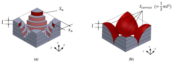 In Figure 6a, the radius xn of the cylindrical element in the nth division is expressed as in Equation (3), where k is the number of divisions of the hemisphere in the x-direction.